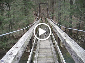 The trail followed the old road bed for quite a while and we passed a couple more small waterfalls coming down from small branch streams. None of them were quite as pretty as the ones we had passed, but they were all still nice to walk by. We crossed the river on a long suspension bridge that rocked and swayed as you tread on it. The dogs were very unhappy about the crossing, but I loved it. I may or may not have re-enacted a scene from the movie Shrek while getting one of Jake's dogs to cross. After the crossing the trail stayed high up on the gorge hillside and we were left only with glances down at the river below. Fortunately, there were also spring wildflowers blooming along this section of trail. I pulled out my hand-dandy field guide and identified trout lilly, rue anemone, yellow downy violets (I can't stop laughing about a yellow violet, what a name!) and bloodroot. There were a few others that I didn't get good ID's on.